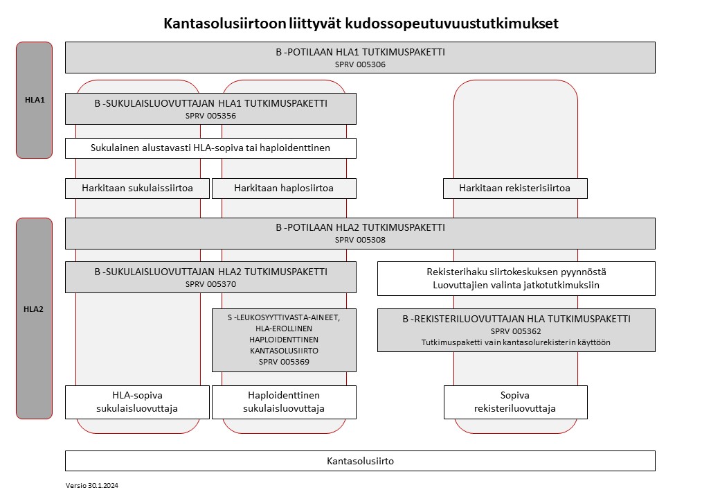 Suomessa kaikki kantasolusiirtoihin liittyvät kudossopeutuvuustutkimukset on keskitetty Veripalveluun. Tällöin voidaan tehdä arvio kudossopeutuvuudesta samoilla kriteereillä useista luovuttajaehdokkaista. Tämä mahdollistaa luovuttajaehdokkaiden keskinäisen vertailun ja nopeuttaa parhaan käytettävissä olevan kantasoluluovuttajan valintaa.